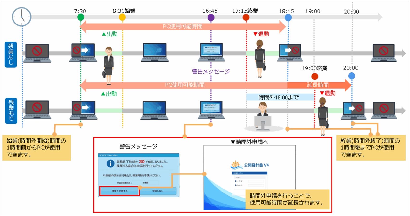 また、「SKYSEA Client View」のPC使用を制御する機能と、「公開羅針盤V4 庶務事務」の勤務シフト管理や時間外申請が行える機能を組み合わせて、勤務時間外の時間帯におけるPC使用を制御します。勤務時間以外にPCを使用できなくすることで未申請の残業を抑制し、職員の適正な働き方を促進することができます。
