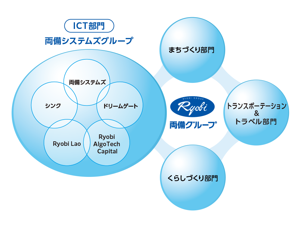 両備システムズは、両備グループのICT部門に属する関係会社4社(株式会社シンク、株式会社ドリームゲート、株式会社Ryobi AlgoTech Capital、Ryobi Lao Co., Ltd.)と共に両備システムズグループを構成し、互いに連携することで、お客様にトータルソリューションを提供しています。