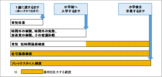 <両立支援制度と対象となる子の年齢(学齢)> ※フレックスタイム制度:7月16日より開始