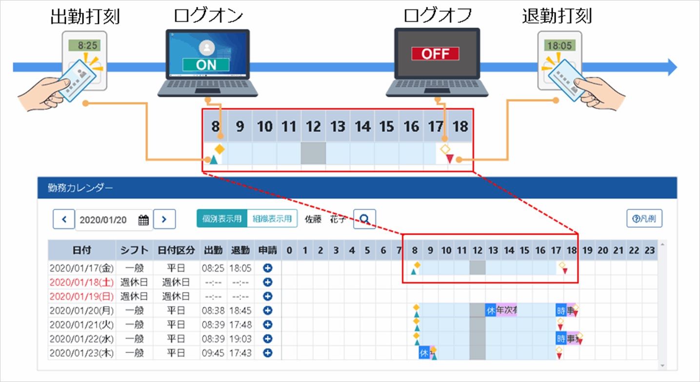 本連携ソリューションでは、「SKYSEA Client View」で記録されるクライアントPCの操作ログ(操作開始 / 操作終了時刻)を「公開羅針盤V4 庶務事務」に取り込み、「公開羅針盤V4 庶務事務」で管理する打刻情報と操作ログの差異を確認することで、勤務時間の実態を把握できます。