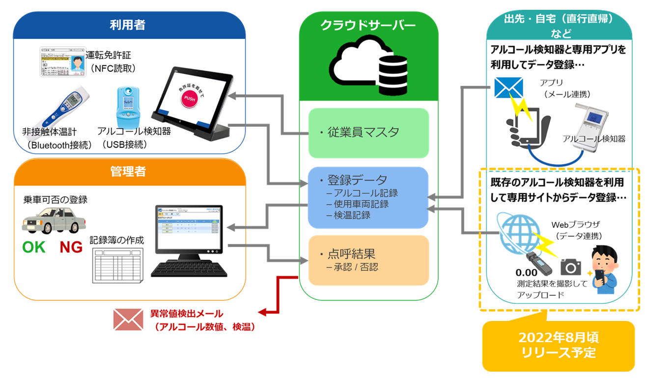 株式会社両備システムズ(本社:岡山県岡山市、代表取締役社長:松田 敏之、以下 当社)は、2022年4月より、改正道路交通法施行規則の施行に伴い、安全運転管理者の選任義務がある事業者(以下、白ナンバー事業者)に対し、運転前後に運転者の酒気帯びの有無を目視でアルコールチェックを行うこと、またその記録を1年間保存すること、さらに2022年10月からは、運転前後に運転者の酒気帯びの有無をアルコール検知器を用いて行うこと、そしてアルコール検知器を常時有効な状態に保つことが義務化されます。2022年の改正(以下、本改正)事項の遂行を支援するため、タブレット端末やPC(パソコン)とアルコール検知器および非接触体温計を自動連携するクラウド型アルコール検査記録システム「アルコールチェック:ご安全に!」(以下、本システム)の販売を2022年3月8日より開始いたします。
