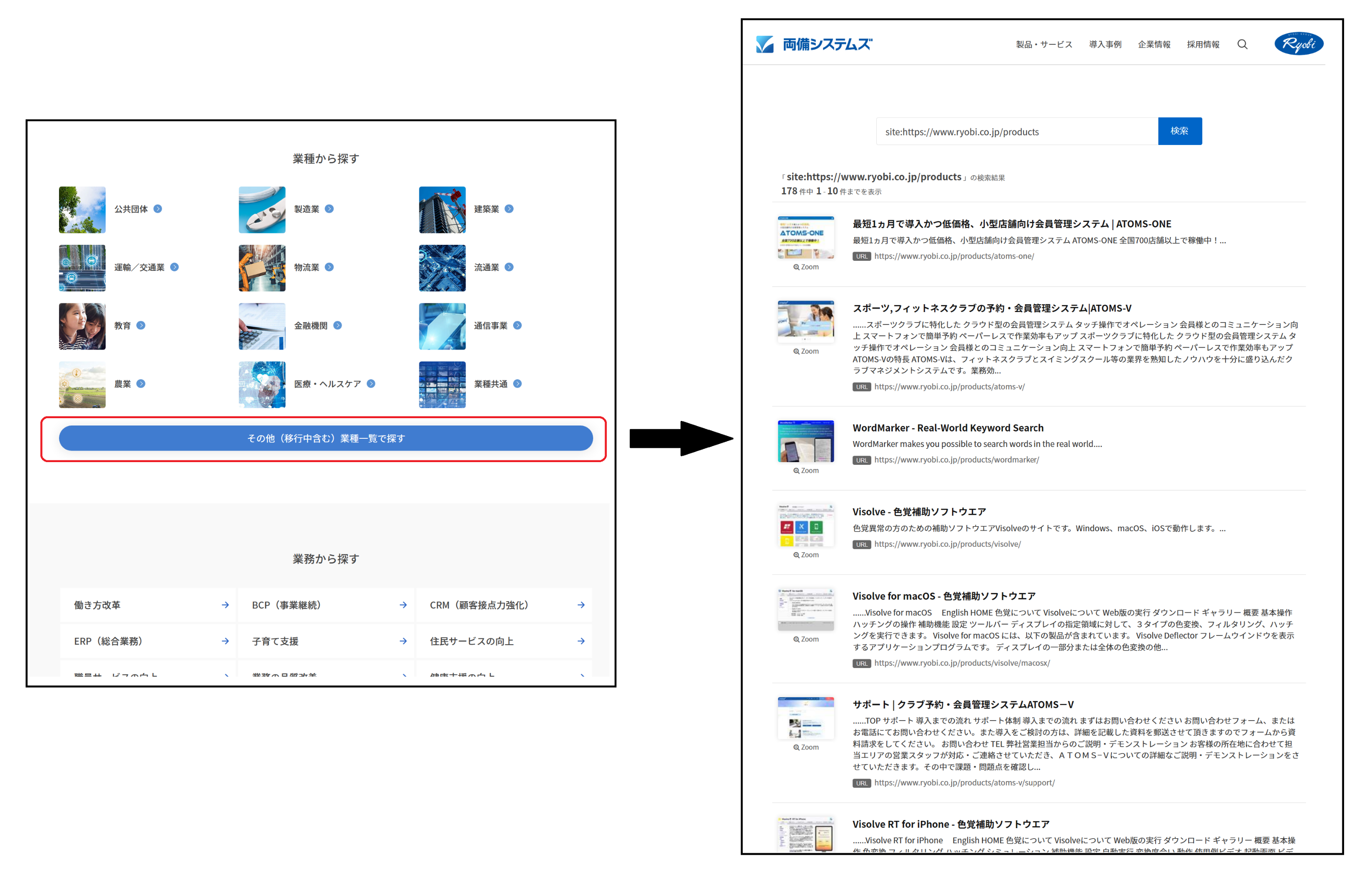 現在、コーポレートサイト改修につき、弊社の提供中の製品・サービスのうち「業種から探す」で表示されないものがあります。その場合は、恐れ入りますが以下の「移行中の製品・サービス閲覧方法」のとおりご不便をおかけしますが、何卒よろしくお願いいたします。