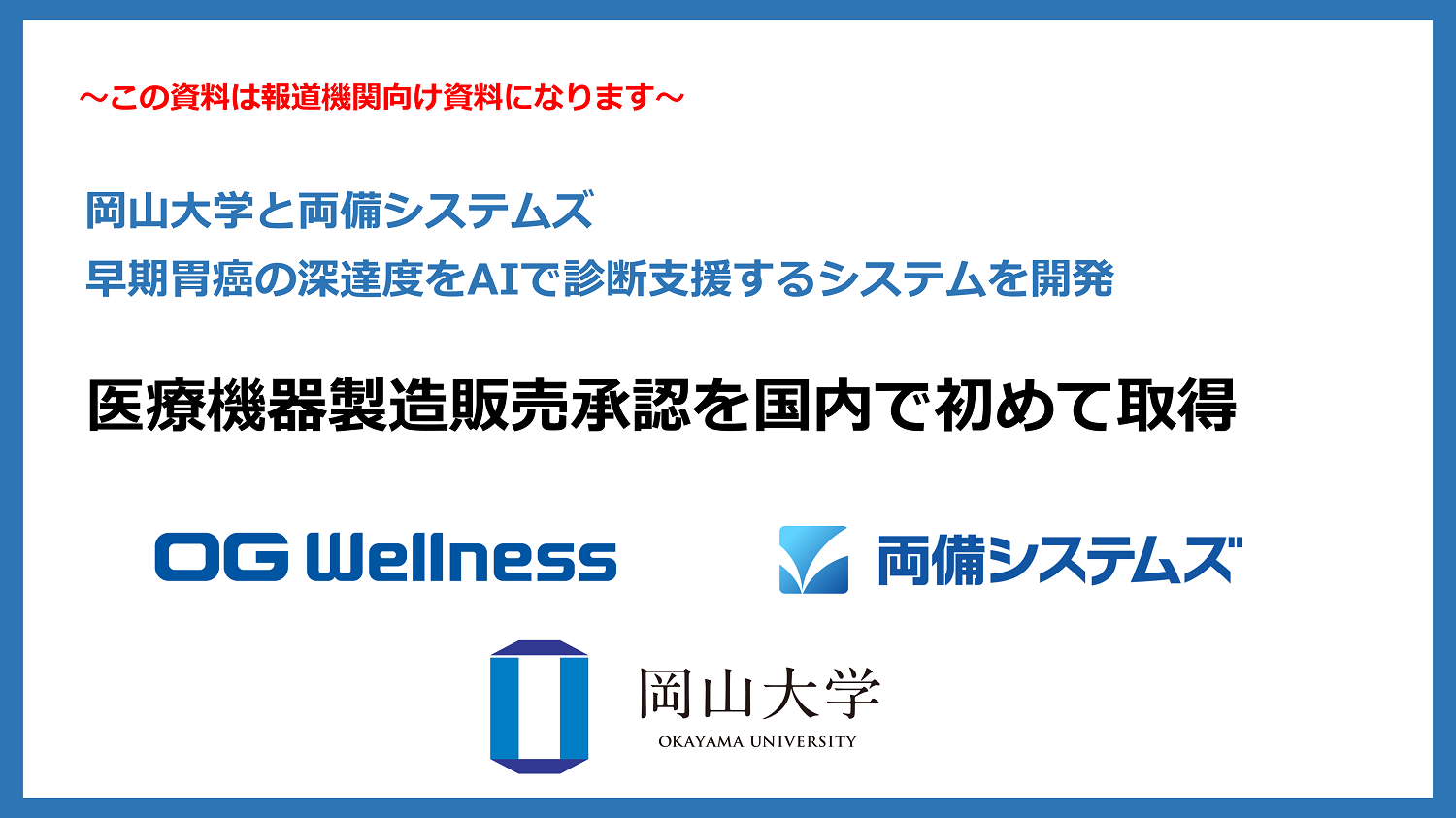岡山大学学術研究院医歯薬学域の河原 祥朗教授(研究責任者:実践地域内視鏡学講座、以下 岡山大学)と、株式会社両備システムズ(本社:岡山県岡山市、代表取締役社長:松田 敏之、以下 両備システムズ)は、内視鏡検査の画像を元に、人工知能(AI)を用い早期胃癌(がん)の深達度を判定し、医師の診断補助を行う早期胃癌深達度AI診断支援システム(以下 本システム)を開発しました。本システムは、オージー技研株式会社(本社︓岡⼭県岡⼭市、代表取締役社⻑︓奥⽥ 宏、以下 オージー技研)によって、2024年3月5日付で厚生労働大臣より医療機器製造販売承認を取得したことをご報告します。本システムは、AIを活用して早期胃癌の深達度診断を支援する医療機器として日本で初めて(※1)承認されたものとなります。