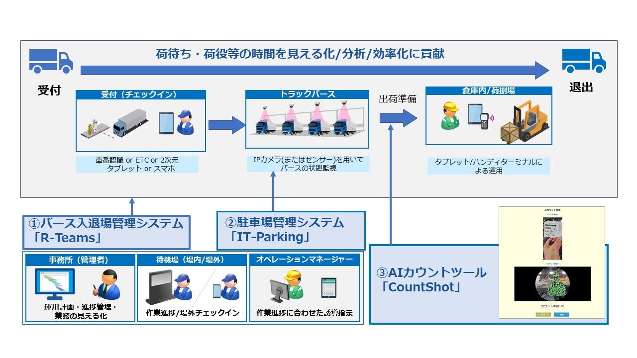 物流センターや倉庫などで、荷積み・荷卸しのために到着したトラックの、受付から退場までの時間を管理し、トラックの待ち時間を約20%削減が可能なバース入退場管理システム「R-Teams(アールチームス)」をベースに、数の確認時間を約20%時間短縮できるAIカウントツール「CountShot(カウントショット)」を組み合わせることで、1運行あたりの荷待ち、荷役作業等にかかる時間を約30%削減(最大60%削減)することができます。