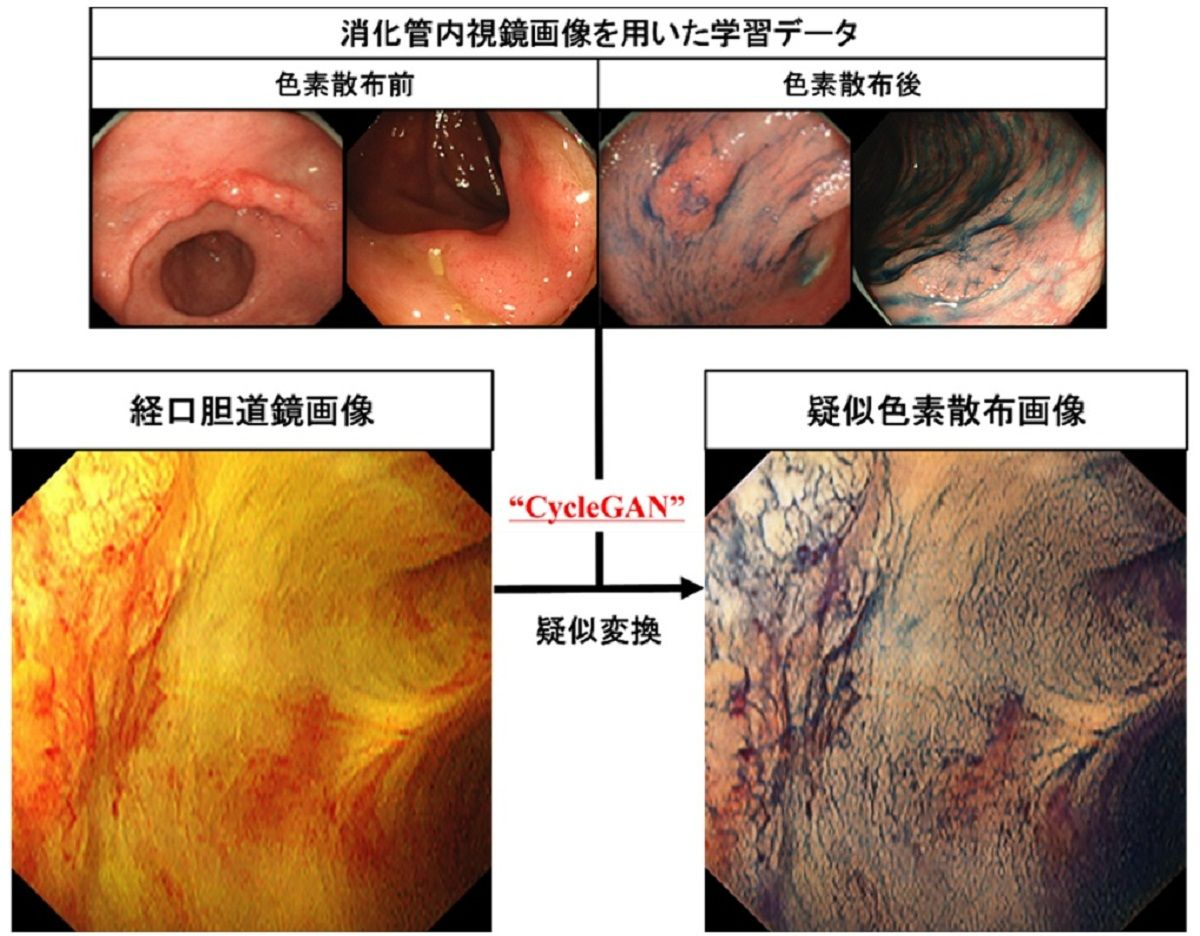 図2:色素散布前後の消化管内視鏡画像を学習データとして使用し、経口胆道鏡画像をCycle GANというAIを用いた画像スタイル変換技術によって疑似色素散布画像へと変換することに成功した。