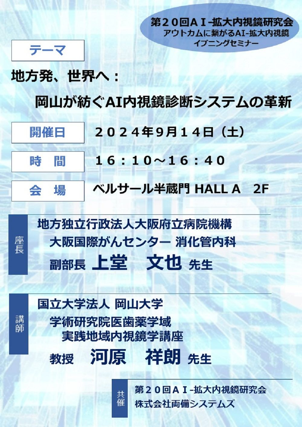 株式会社両備システムズ(本社:岡山県岡山市、代表取締役社長:松田 敏之、以下 当社)は、2024年9月14日(土)、内視鏡分野の学会「第20回 AI-拡大内視鏡研究会」のイブニングセミナーを第20回AI-拡大内視鏡学会(静岡県立静岡がんセンター内視鏡科)と共催し開催いたします。