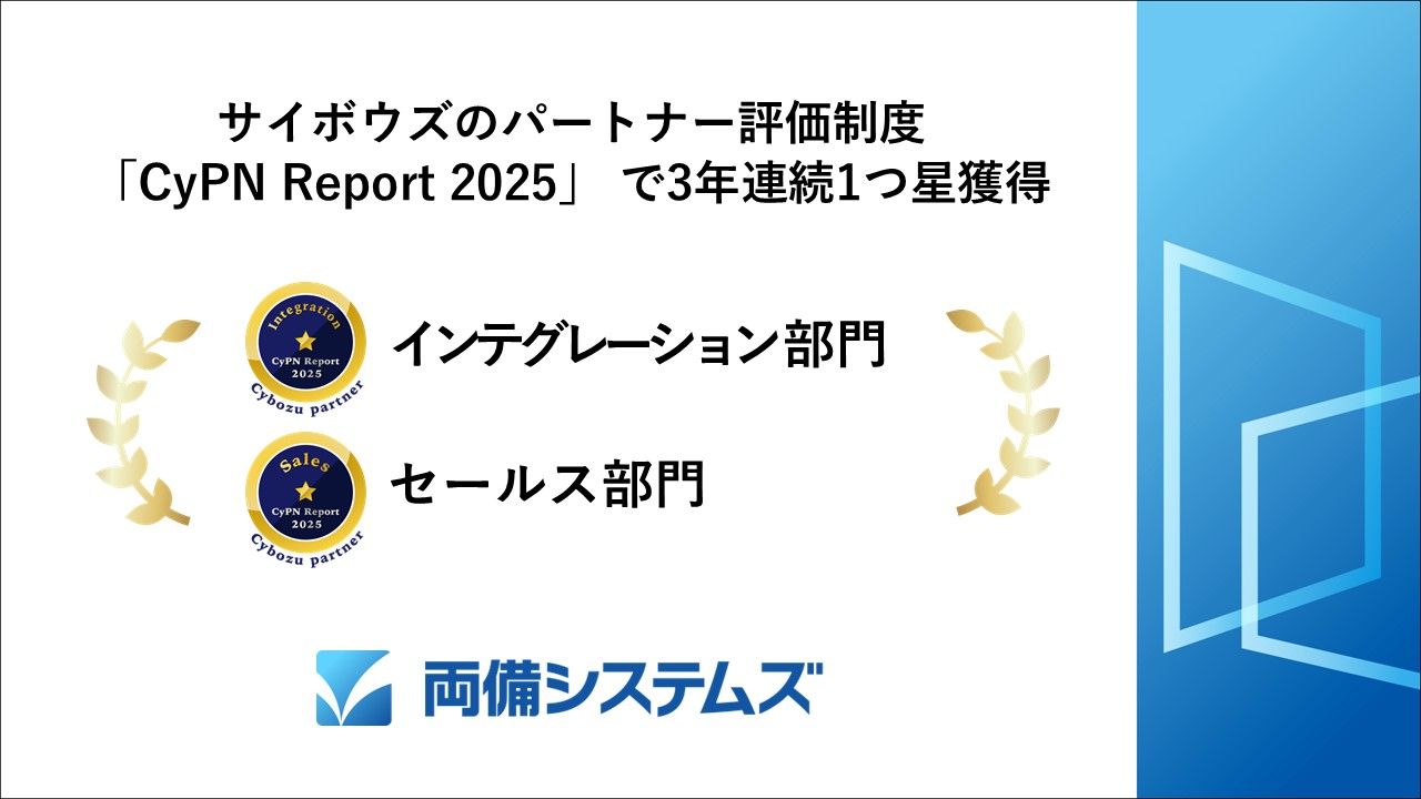 株式会社両備システムズ(本社:岡山県岡山市、社長:松田 敏之、以下 当社)は、オフィシャルパートナーであるサイボウズ株式会社(本社:東京都中央区、代表取締役社長:青野 慶久、以下 サイボウズ)のパートナー評価制度「Cybozu Partner Network Report 2025」(以下 CyPN Report 2025)において、「セールス部門(サイボウズ製品の提案・導入支援など)」ならびに「インテグレーション部門(開発・構築・コンサルティング・教育など)」の2部門で1つ星の評価を獲得しました。今回で3年連続、一つ星を獲得いたしました。