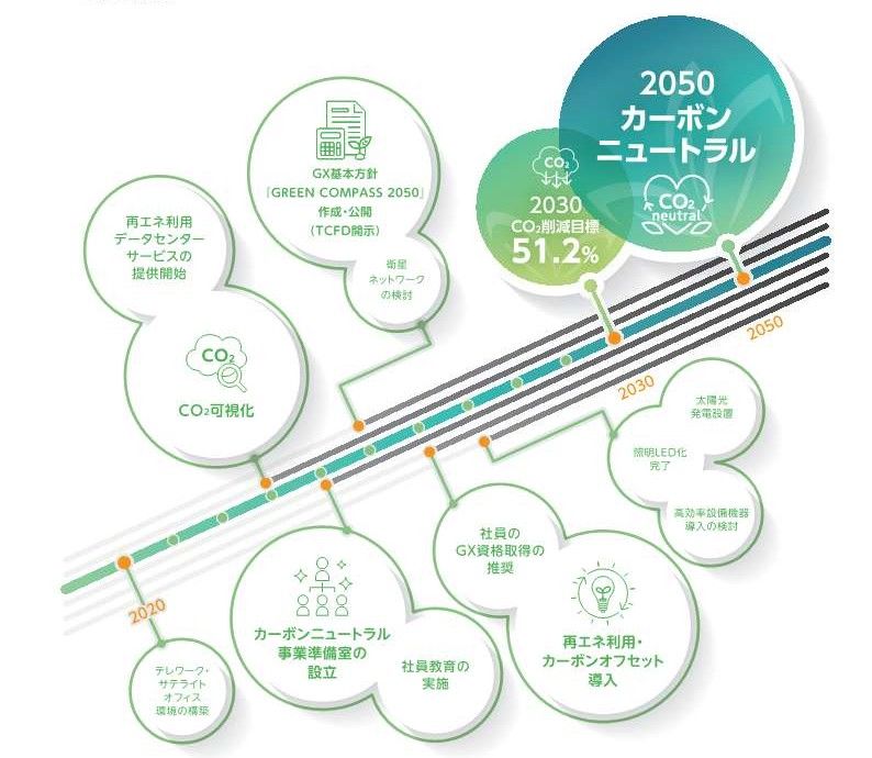 2030年に2020年度比でCO₂排出量を51.2%削減するという中期目標を掲げ、働き方・サービス・設備・人づくりのすべてを通じて、サスティナブル社会の実現に取り組んでいます。本ロードマップでは、ICT インフラの環境配慮をはじめとした社内外でのGX 実践を土台に、脱炭素社会に向けた道のりを段階的に整理しています。社員教育や資格取得支援、再エネの活用・導入、設備の省エネ化といった取り組みを積み重ねながら、2050年のカーボンニュートラル達成を目指します。