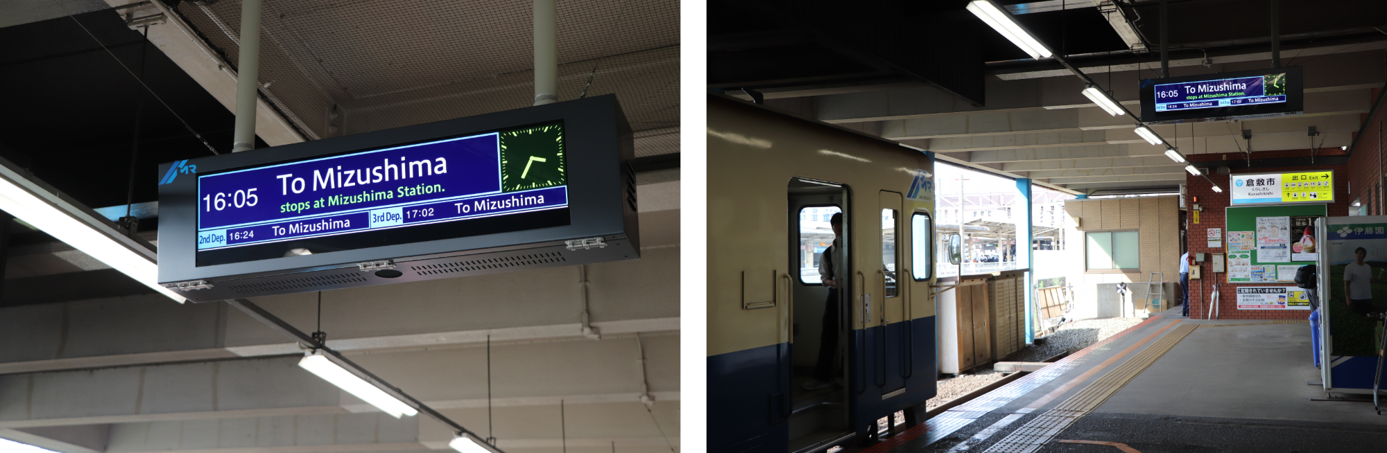 左)英語対応されたデジタルサイネージ、右)倉敷市駅設置の様子