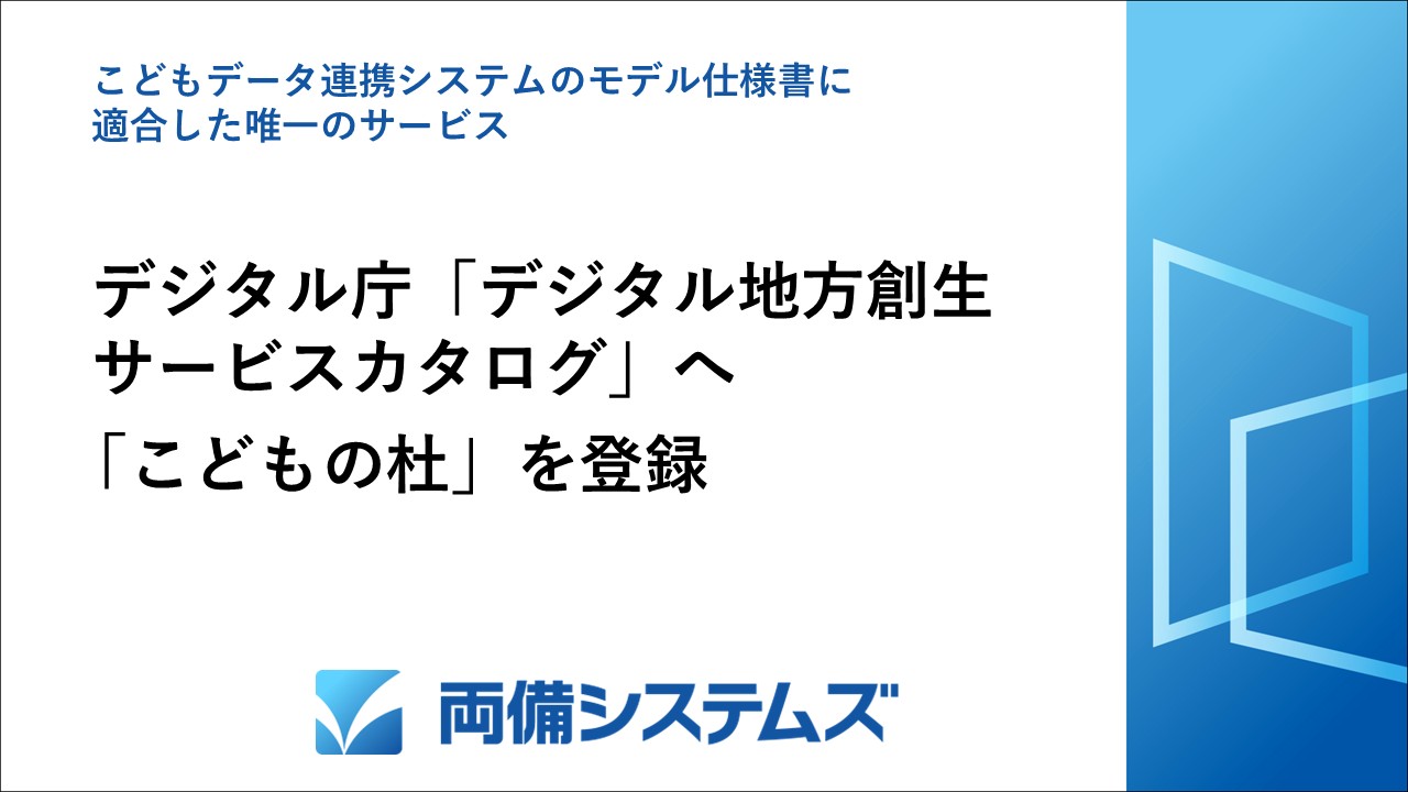 株式会社両備システムズ(本社:岡山県岡山市北区、代表取締役社長 松田敏之、以下 当社)は、デジタル地方創生サービスカタログ(デジタル庁公開)において、政府の策定する「こどもデータ連携システムモデル仕様書」に唯一適合したサービスとして「こどもに関するデータ連携プラットフォーム『こどもの杜』」(以下、こどもの杜)を登録いたしました。地域未来交付金の申請における優遇措置としてご利用いただくことが可能となりました。