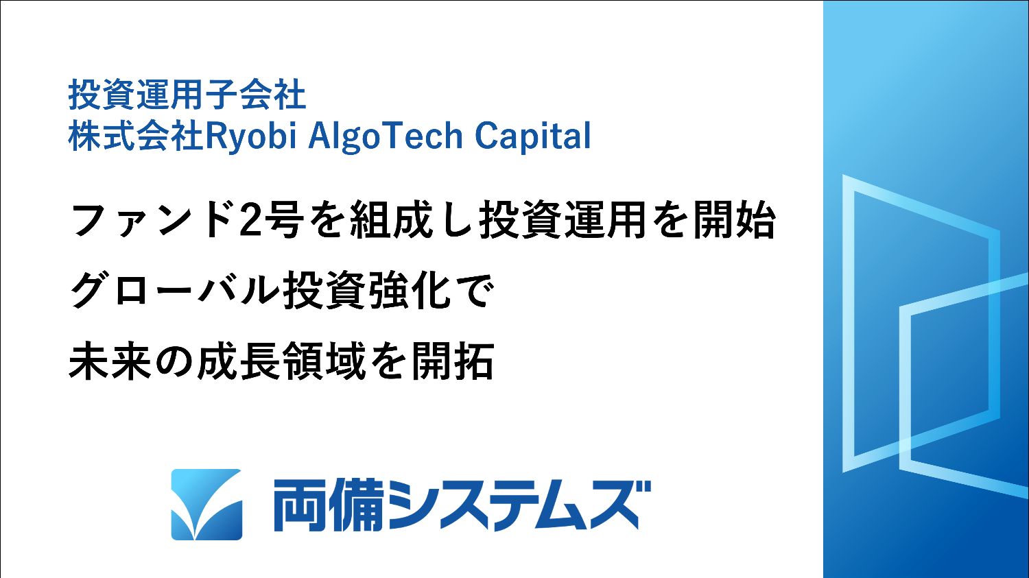 株式会社両備システムズ(本社:岡山県岡山市、代表取締役社長 松田敏之)の投資運用子会社、株式会社 Ryobi AlgoTech Capital(リョウビ・アルゴテック・キャピタル)(本社:東京都港区、代表取締役社長:小野田吉孝、以下 当社)は、海外における事業成長機会の創出や、先端技術の急速な変化への対応を目的として、2025年10月にCVCファンド第2号(両備システムズイノベーションファンド2号投資事業有限責任組合、以下 当ファンド)を組成し、投資運用を開始いたします。当ファンドは、経済産業省より「外部経営資源活用促進投資事業計画」の認定を受けており、グローバルへの投資比率を70%に引き上げてまいります