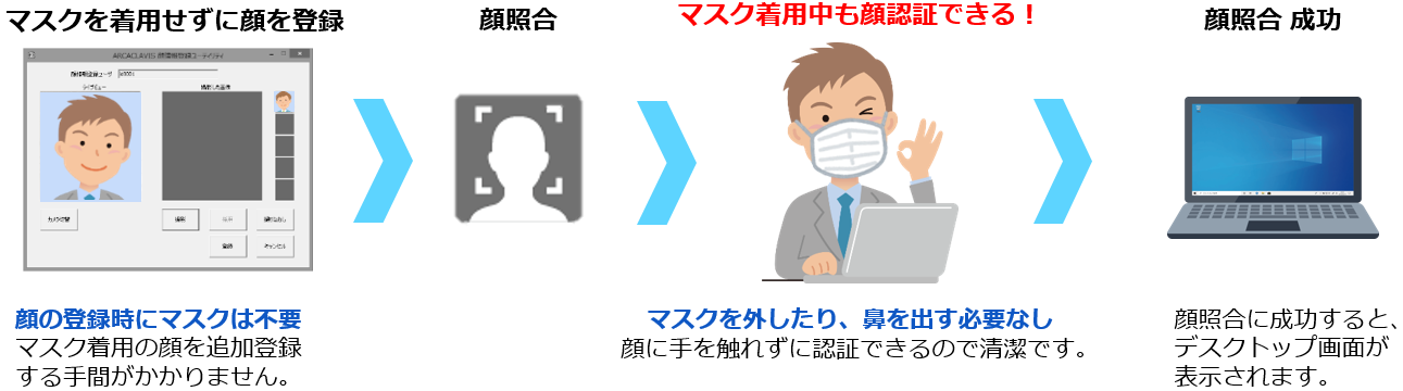 マスクをしたままでも高精度の顔認証が可能になりました。顔認証時にマスクを外したり、ずらしたりする必要がなくハンズフリーで清潔な認証機能を提供します。