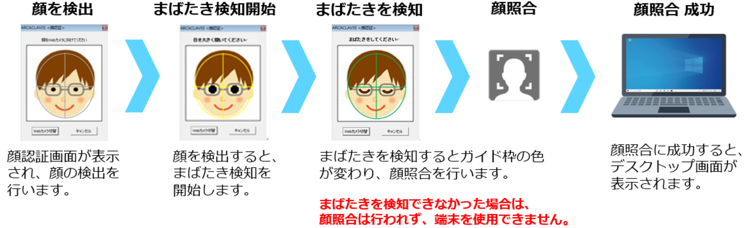 Webカメラに顔を向けるだけで、写真や動画によるなりすましを検知でき、なりすましと判断されなかった場合は顔照合を行います。