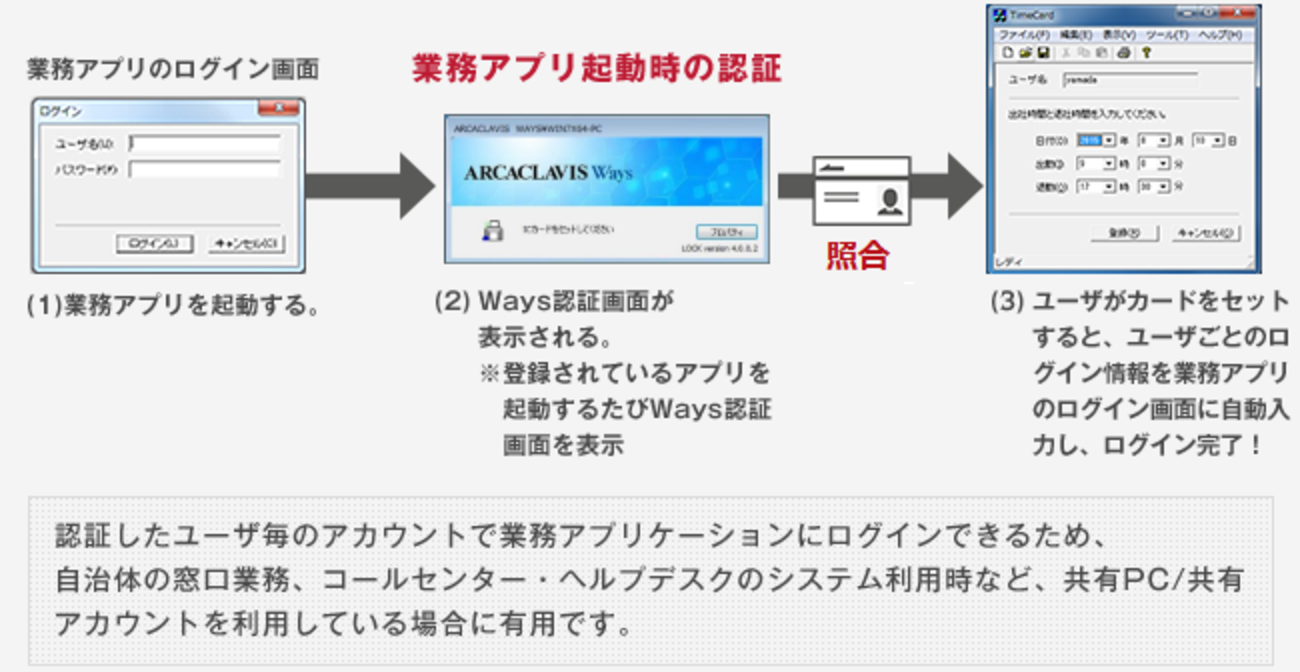そこで、業務アプリケーションへのログイン認証の都度、ICカードや生体情報などの本人照合を要求し、シングルサインオンする機能を追加しました。