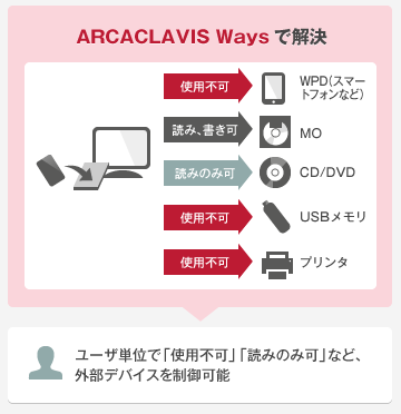 昨今の個人情報漏洩事件で話題となったスマートフォンなどのWPD規格を含め、外部デバイス(MO、CD/DVD、USBメモリ、プリンタ)の利用をユーザ単位で制御する機能を追加しました。