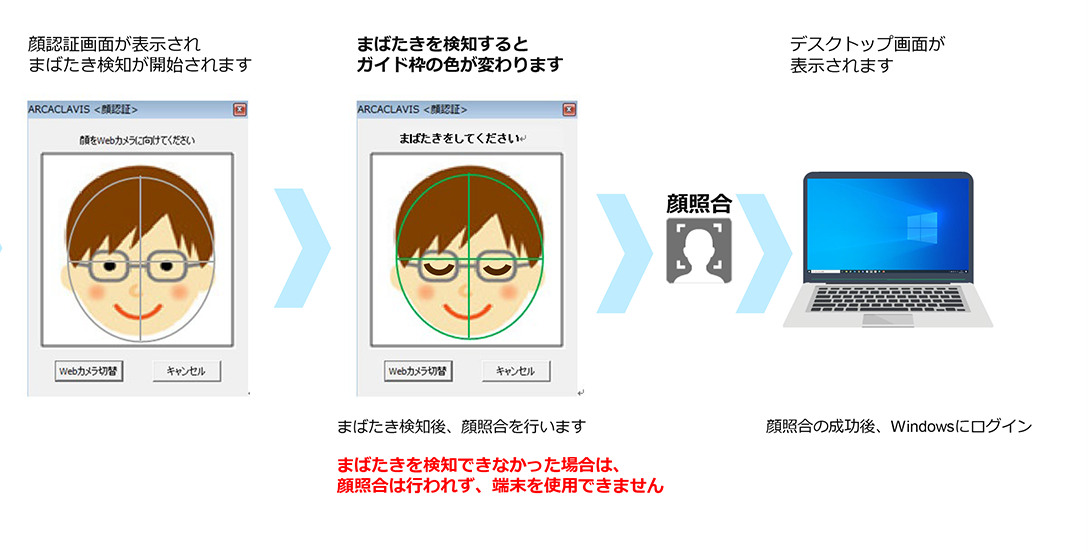 Webカメラに顔を向けるだけで、写真や動画によるなりすましを検知でき、なりすましと判断されなかった場合は顔照合を行います。