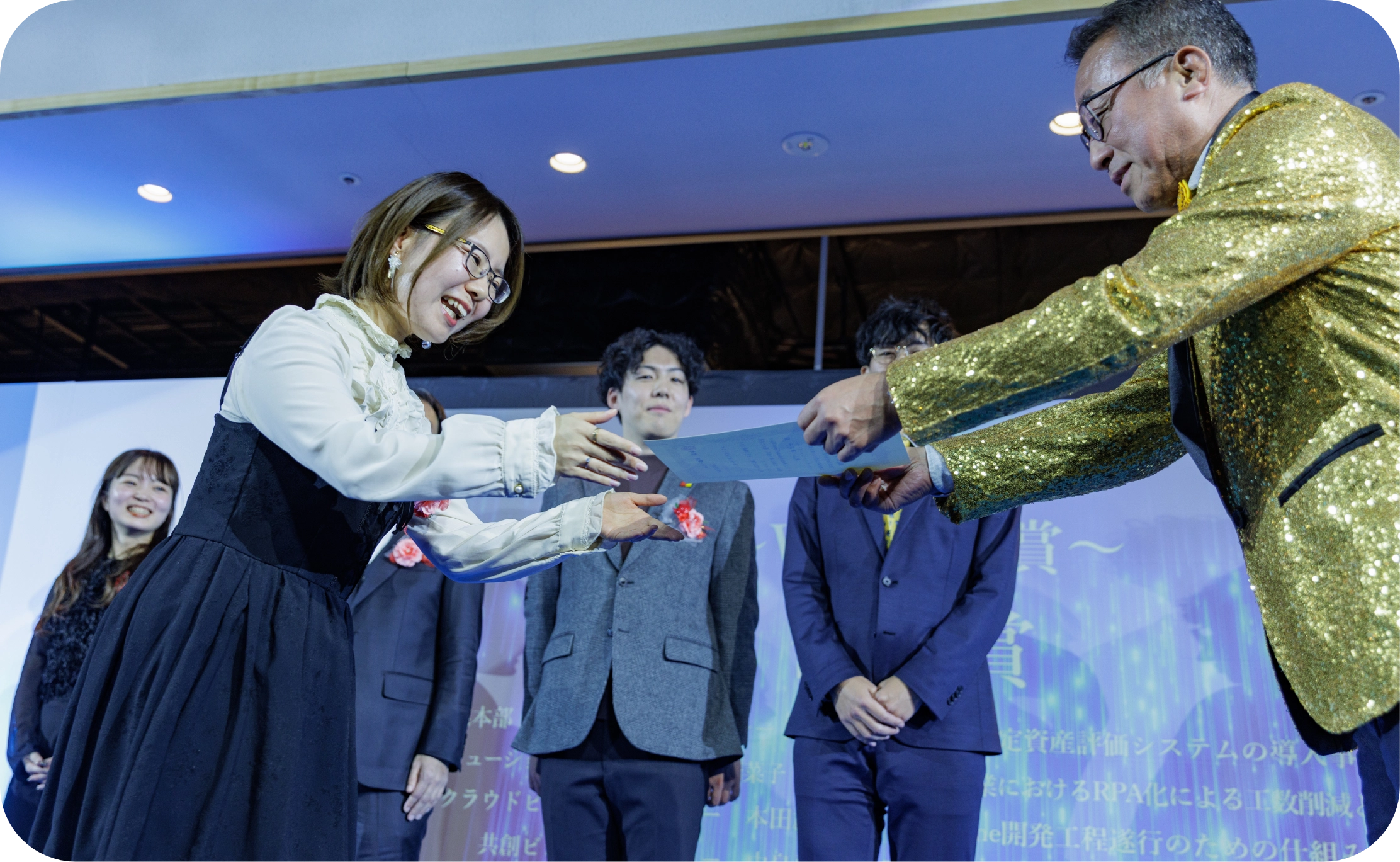 ダンスやジャズ演奏をはじめとした有志たちによるアトラクションがアワードを彩りました。これらの演目は、社員同士が互いを知り、縦横につながりを深めながら、それぞれの得意分野を披露する機会にもなっています。そのメインイベントは各賞の受賞者発表です。ビジネスへの貢献、社内業務の効率化や合理化への寄与、そしてスキルアップなど、社員のチャレンジや成果を正当に、盛大に評価するものです。ノミネートされるだけでも素晴らしいことですが、この日に発表される順位に誰もがドキドキ。司会者が高らかに名前を読み上げるたびに、会場は歓喜に包まれました。